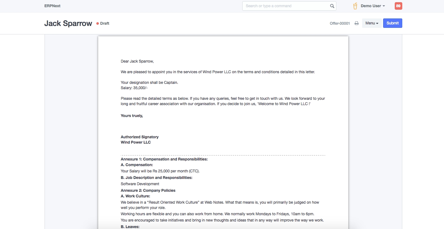 Job Offer is given to selected candidates after interview and selection which states the offered salary package, designation, grade, department, number of days entitled for leave.