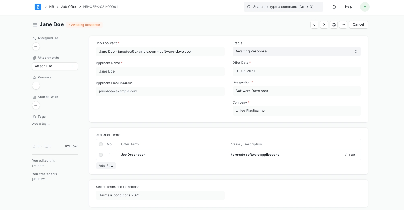 Set the Status of the Job Offer (Awaiting Response, Accepted, Rejected).