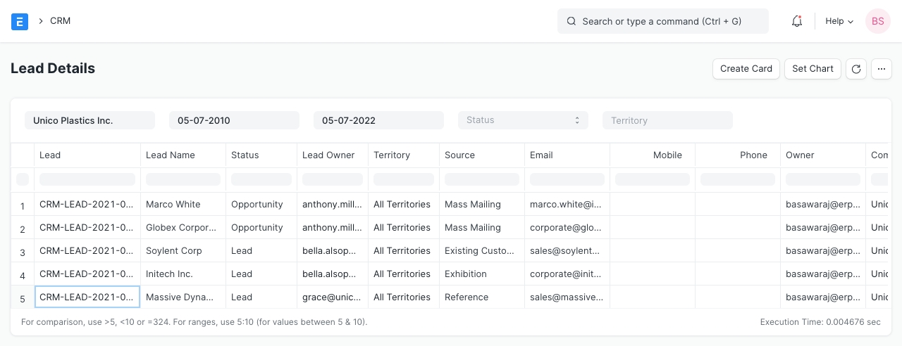 This report provides lead name, address, contact details, lead source, territory, and other details.