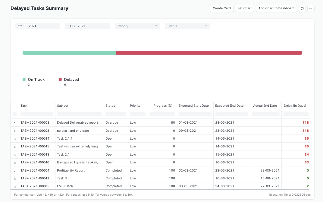 The Delayed Tasks Summary report helps identify the tasks which have exceeded their Expected End Dates.