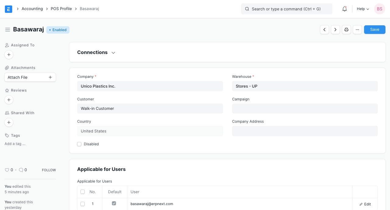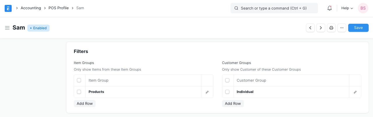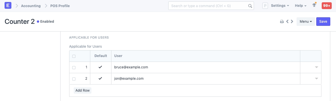 By default, all Sales Users can access the POS Profiles created in ERPNext. However, if you want only certain Users to access certain POS Profiles, you can add them to the table. Once even one User is set in the POS Profile, other Users cannot use this POS Profile for retail transactions.