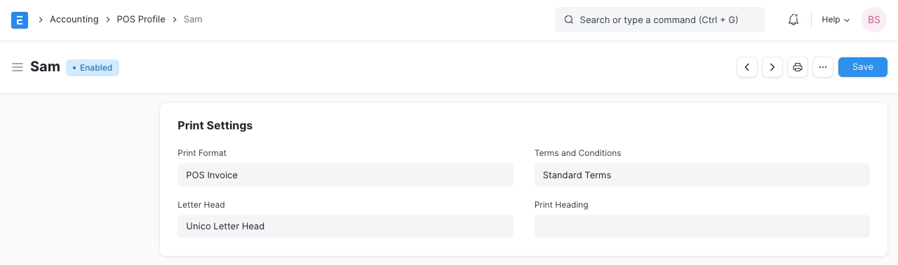 POS Sales Invoice headings can also be changed when printing the document. For example, the heading can be 'Invoice', or 'Bill'. You can do this by selecting a Print Heading. To create new Print Headings go to: Home > Settings > Printing > Print Heading. Know more here.