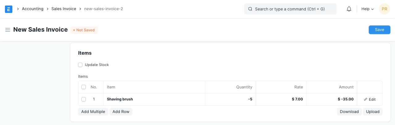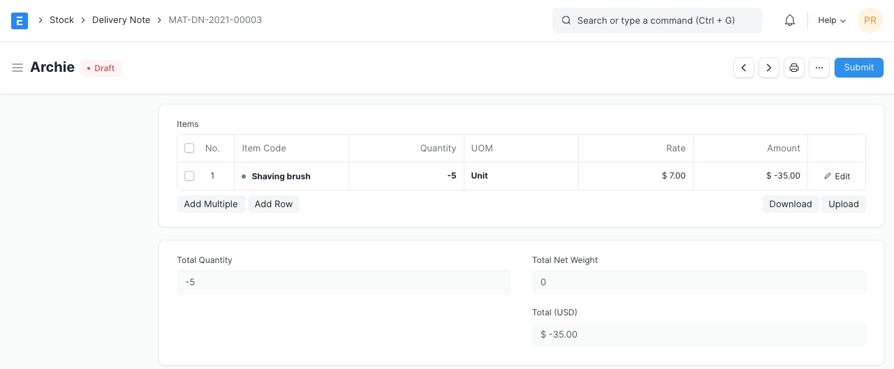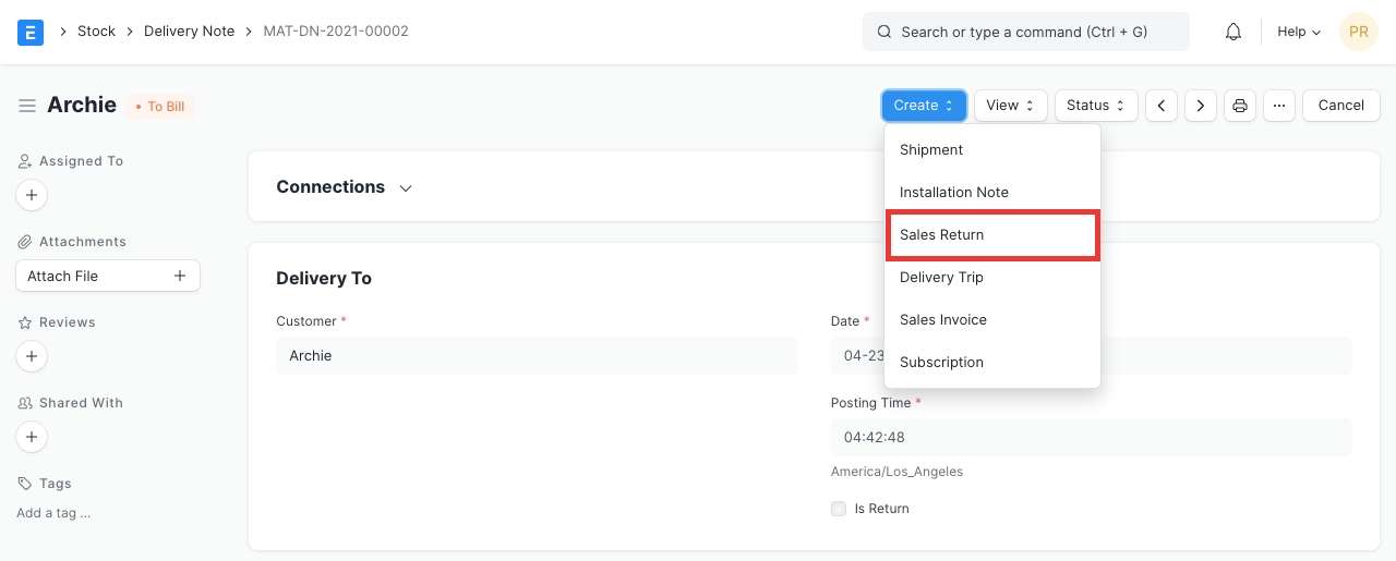 Original Delivery Note Then click on 'Create > Sales Return', it will open a new Delivery Note with 'Is Return' checked, Items, Rate, and taxes will negative numbers.