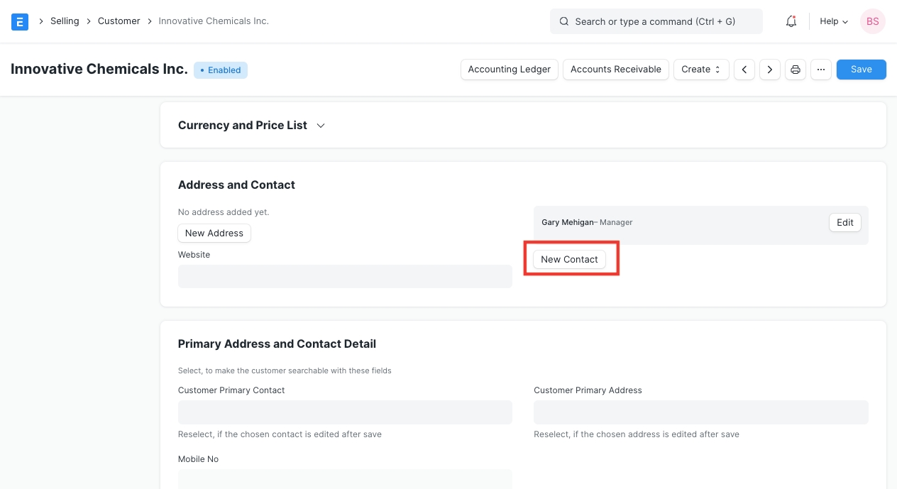 You can also add a Contact from the Customer or Supplier record by clicking on “New Contact” button as shown below.