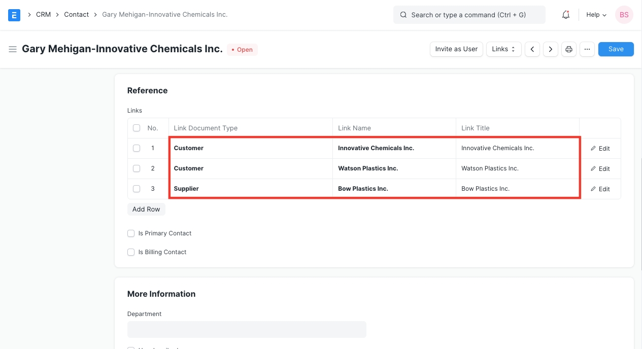 A contact may be linked to multiple customers or multiple suppliers.