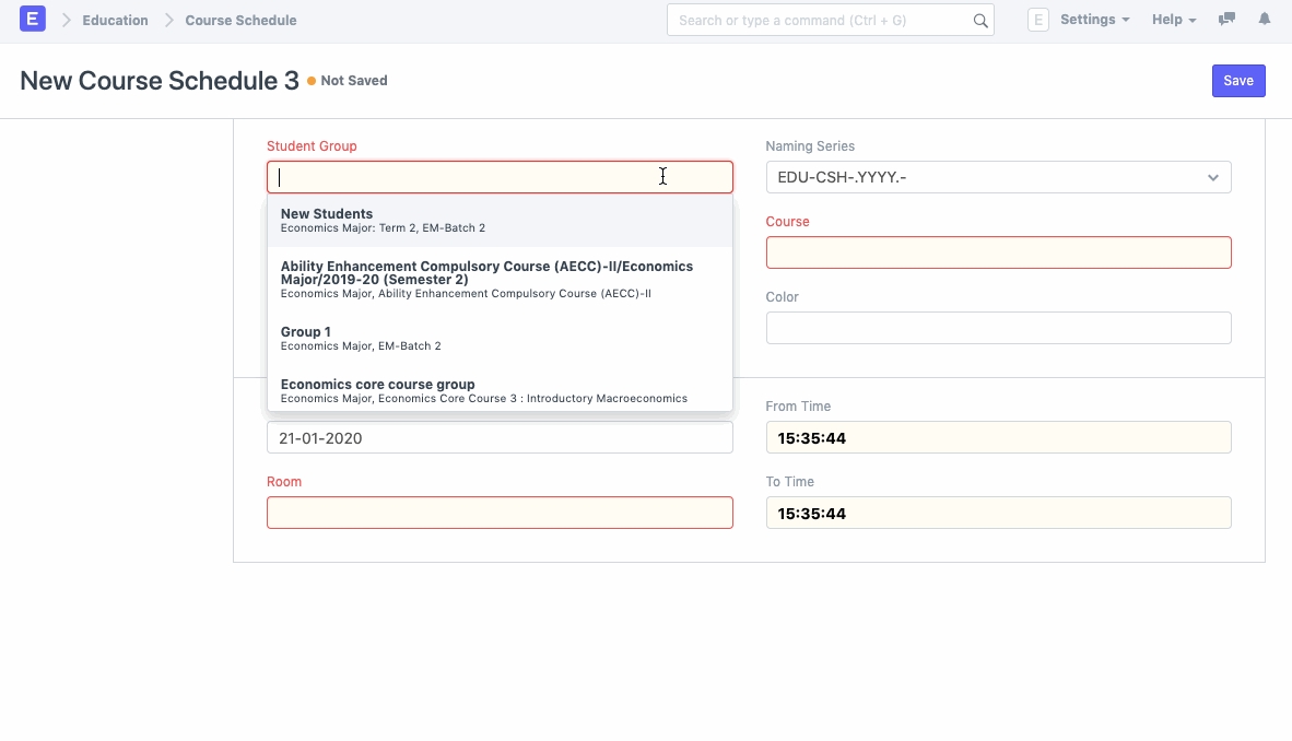 Using this feature, a time table or an itinerary can be created in the Institute, wherein each slot will be scheduled via Course schedule.