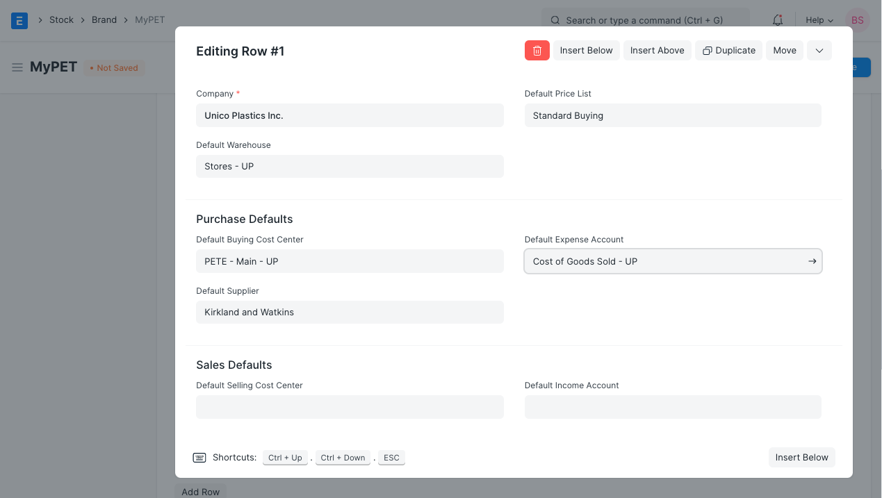 When performing Purchase transactions like Purchase Order, Purchase Receipt, or Purchase Invoice, the defaults set here will be fetched on selecting Item of this Brand.