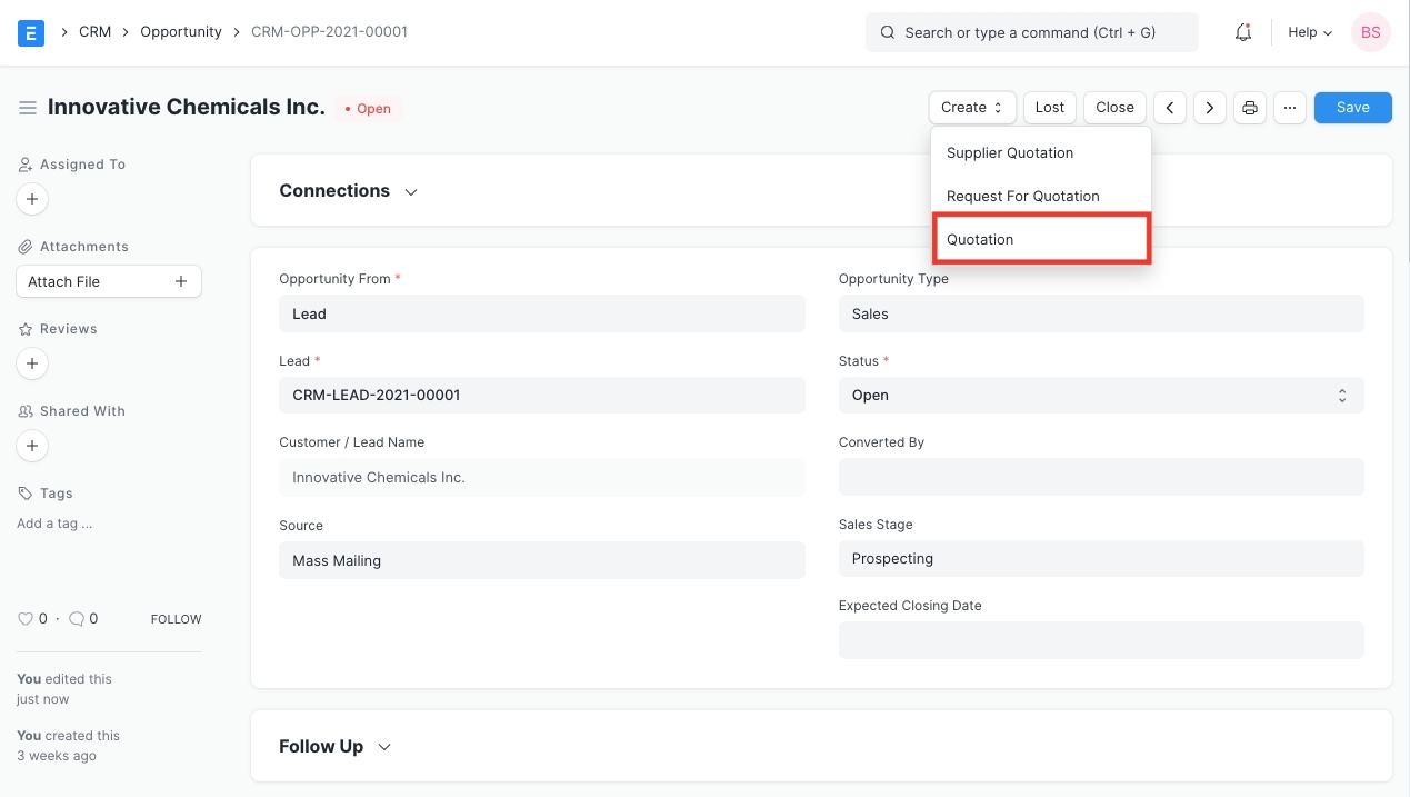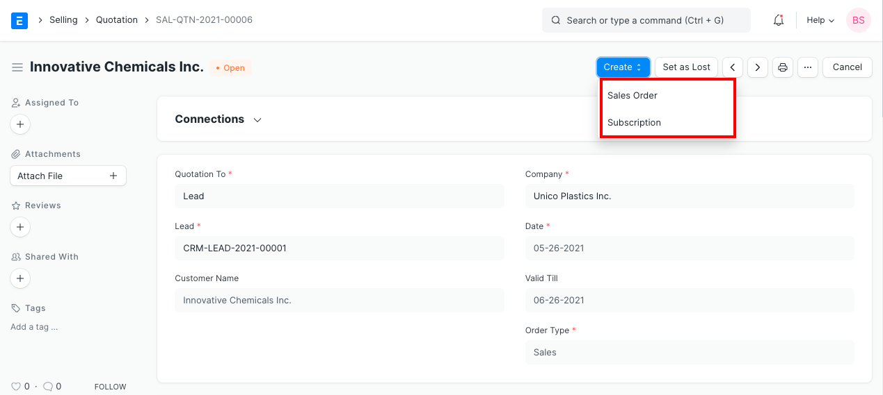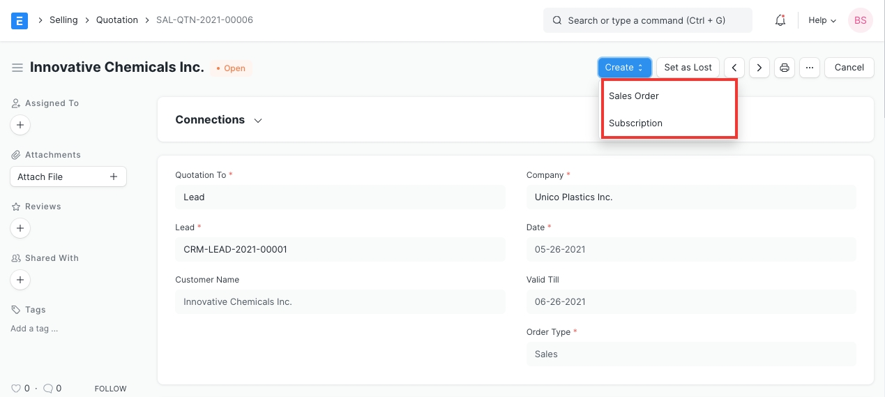 On submitting, you can create a Sales Order or a Subscription from the Quotation using the Create button. In the Dashboard present on the top, you can go to the Sales Order linked with this Quotation. In case it didn't work out, you can set the Quotation as lost by clicking on the 'Set as Lost button'.