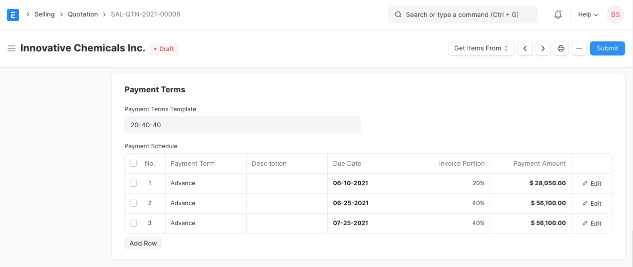 Sometimes payment is not done all at once. Depending on the agreement, half of the payment may be made before shipment and the other half after receiving the goods/services. You can add a Payment Terms template or add the terms manually in this section.