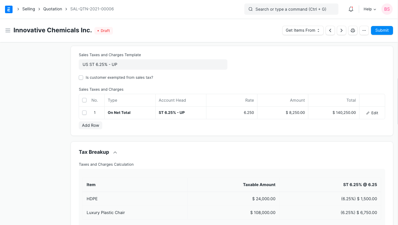 To add taxes to your Quotation, you can select a Sales Taxes and Charges Template or add the taxes manually in the Sales Taxes and Charges table.