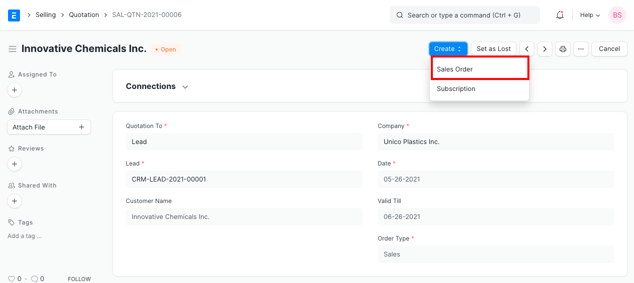You can also create a Sales Order from a submitted Quotation via the Create button on the top right.