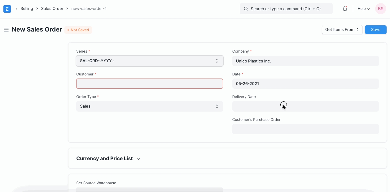 Click "Save" to save a draft of the Sales Order.