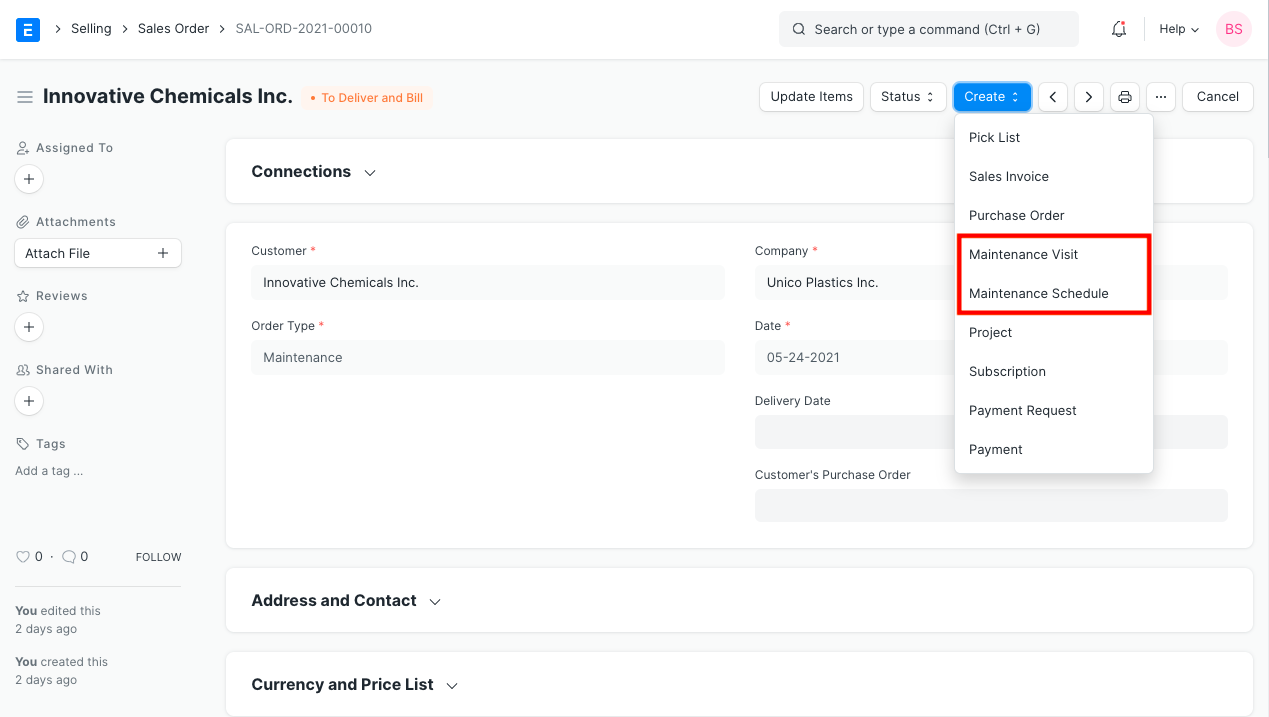 Note 1: By clicking on the Action button and selecting 'Maintenance Visit' you can directly fill the visit form. The Sales Order details will be fetched directly.
