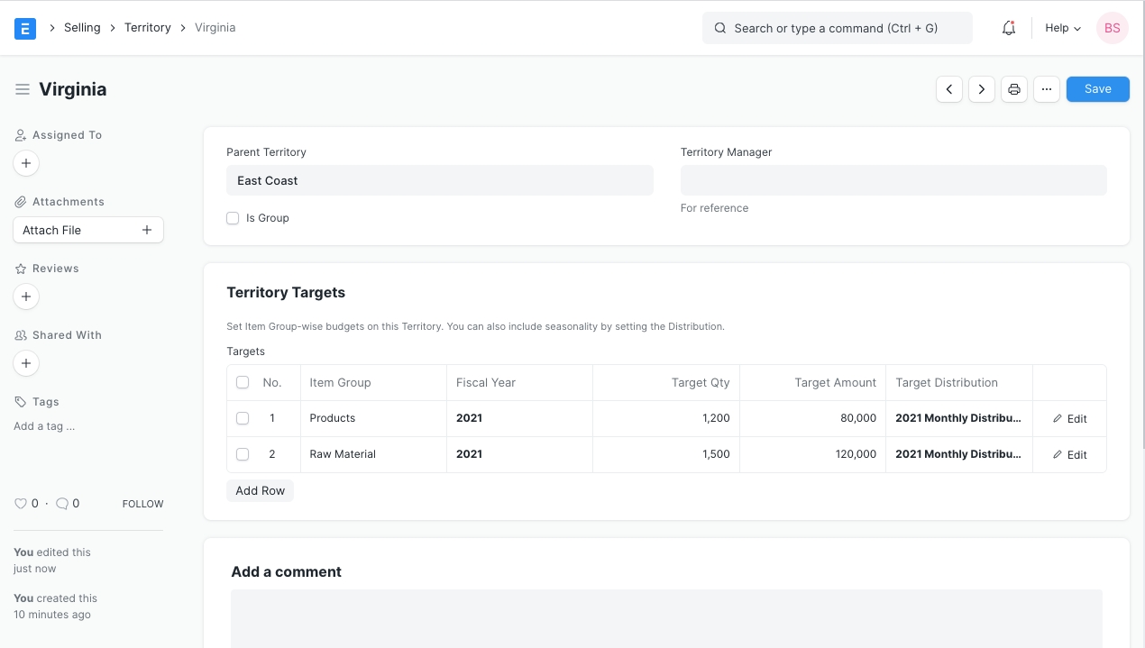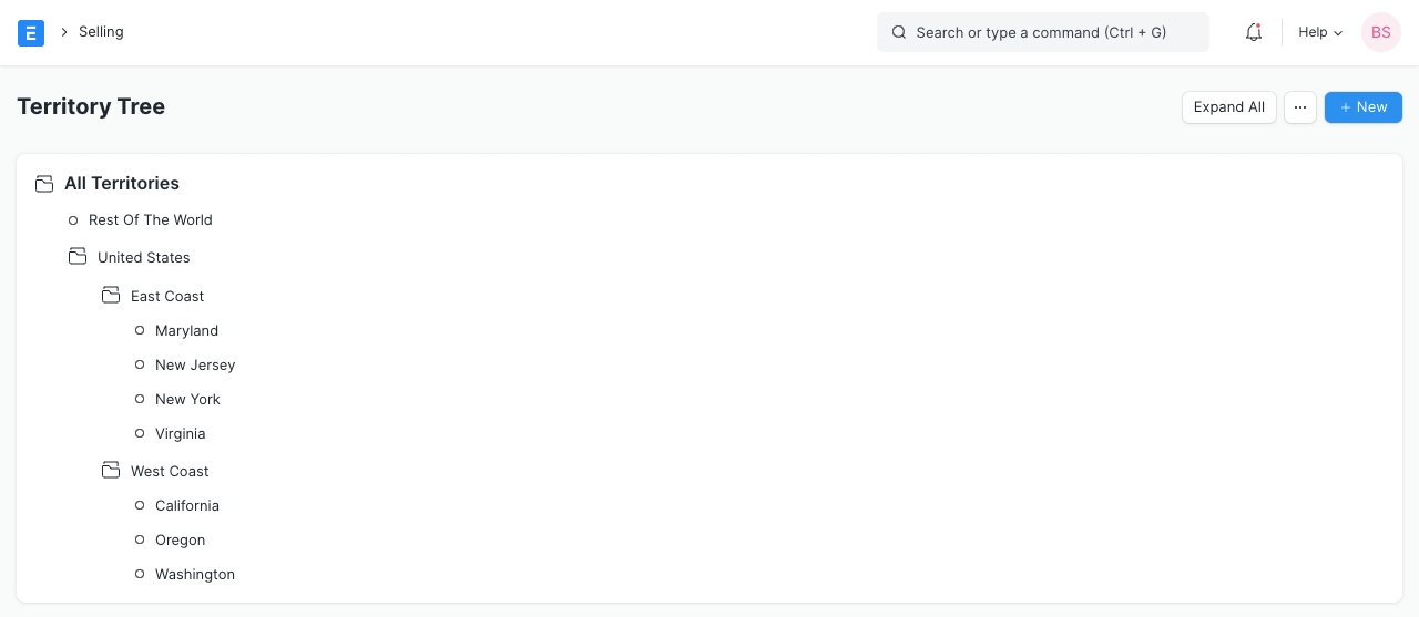 You can add multiple sub-territories under a parent territory. On saving, a territory can be selected in transactions and reports.
