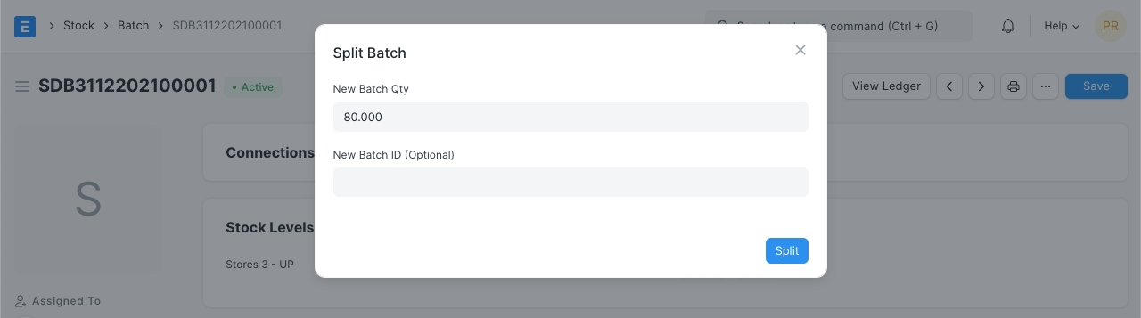 You can also split the batch into smaller one by clicking on the Split button. This will create a new Batch based on this Batch and the quantities will be split between the batches.