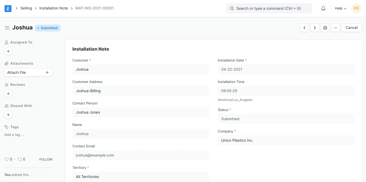 For example, if you sell an Air Conditioner, a service person generally accompanies the delivery to install the Air Conditioner at the Customer’s place. The service person can create an “Installation Note”, to track the date and details of the installation.