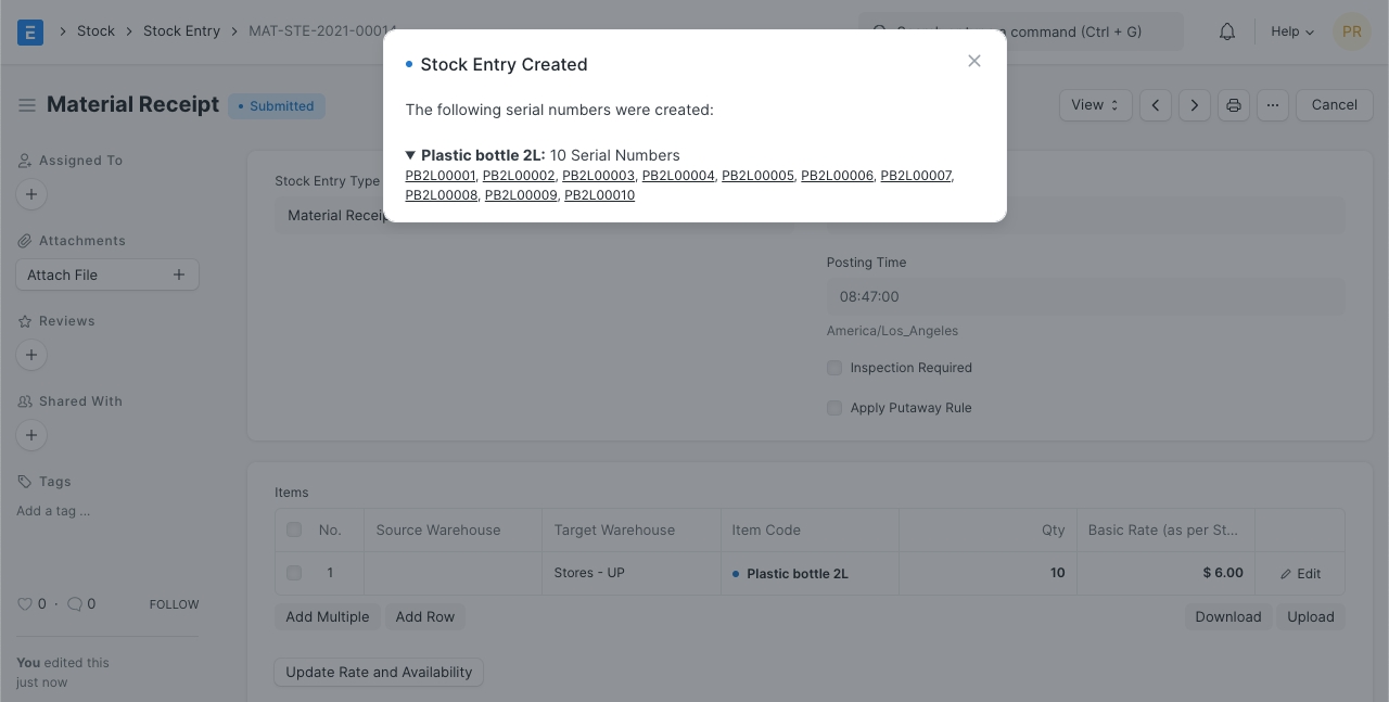 For example, a series was set for the following Item as 'PB2L.#####'. Then a Stock Entry was submitted to receive the Item. The Serial Numbers were created accordingly.