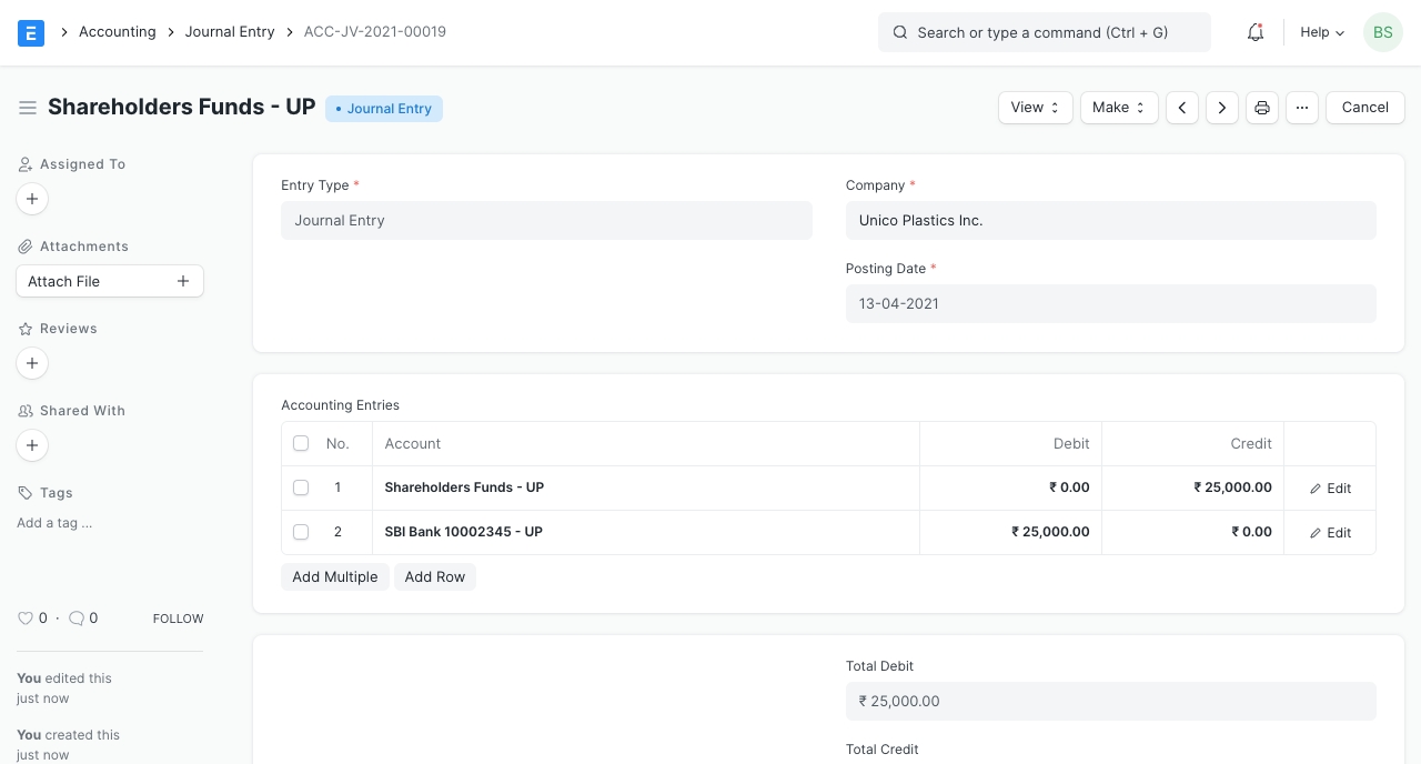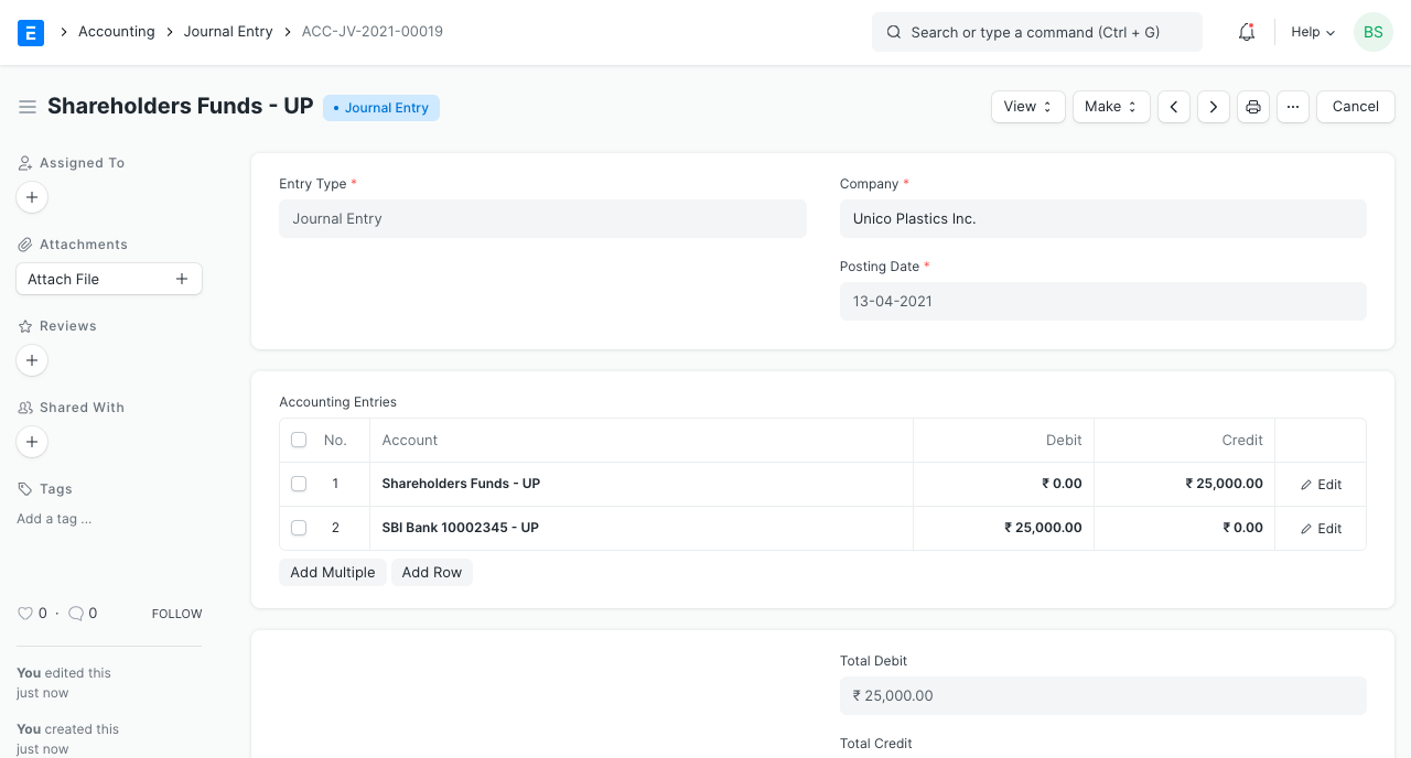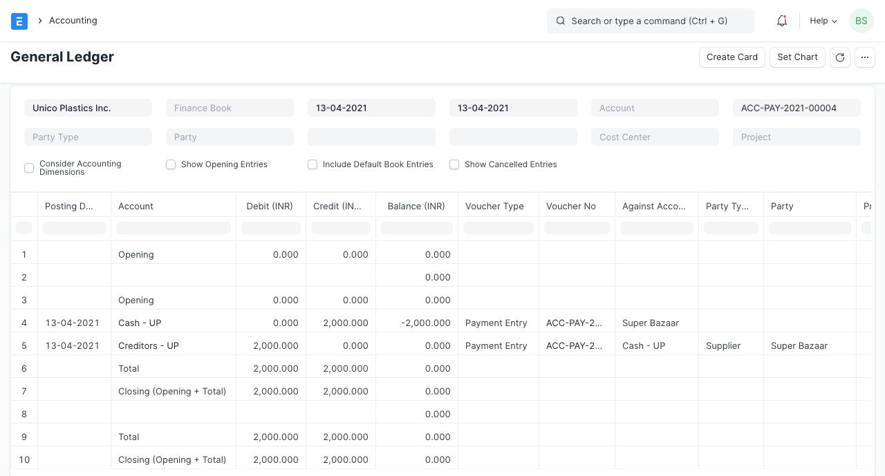 The company needs equipments (stove, teapot, cups, etc.) and raw materials (tea, sugar, milk, etc.) immediately. He decides to buy them from the nearest general store, "Super Bazaar" whose owner is a friend, so that he gets some credit. Equipments cost him Rs. 2800 and raw materials Rs. 2200. He pays Rs. 2000 out of the total cost which is Rs. 5000. This can be recorded in ERPNext using a Payment Entry.