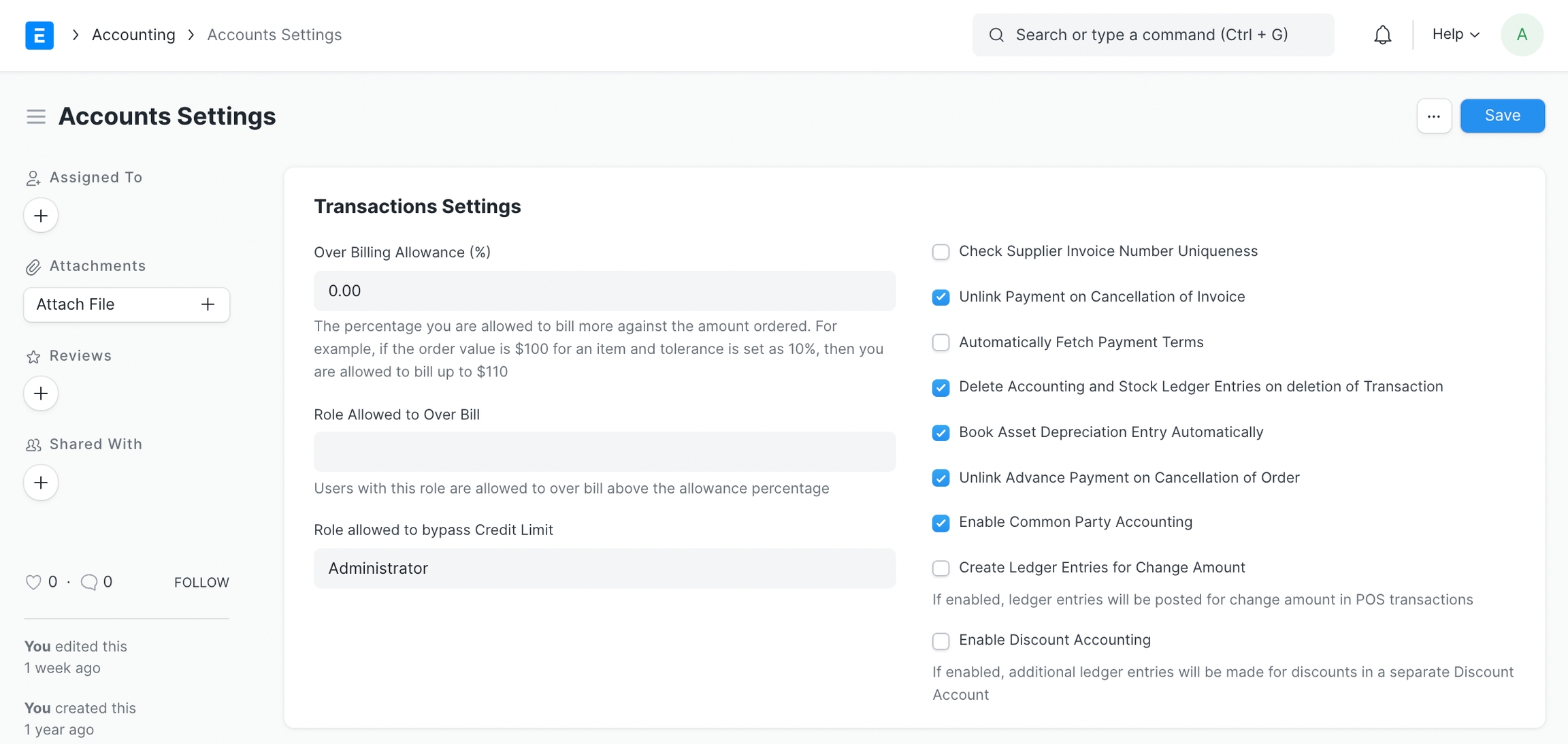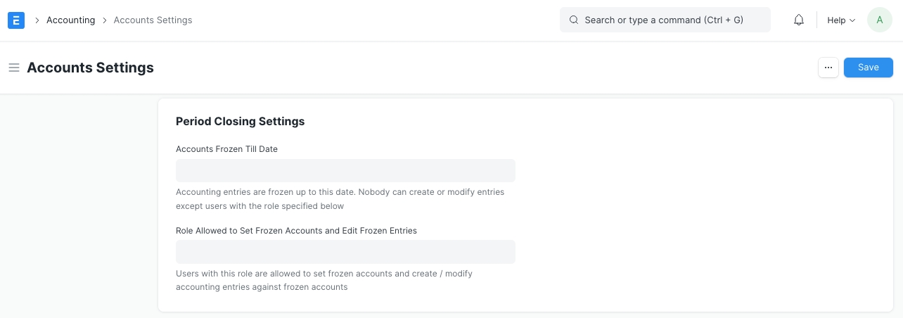 There are various account settings in ERPNext to restrict and configure actions in the Accounting module.