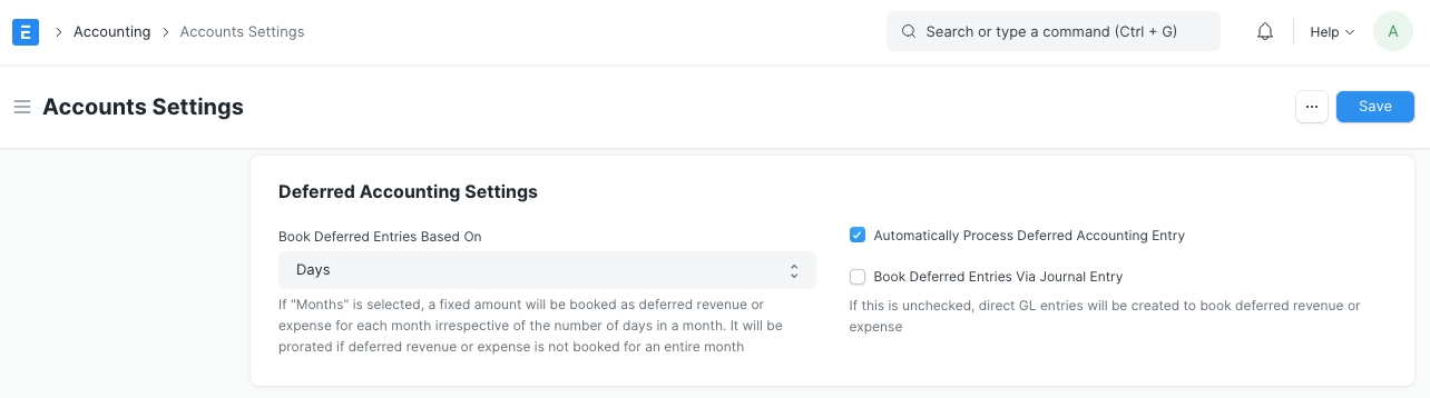 Deferred revenue amount can be booked based on two criteria. The default option here is "Days". If "Days" is selected, the deferred revenue amount will be booked based on the number of days in each month and if "Months" is selected, then it will be booked based on number of months. For Eg: If "Days" is selected and $12000 revenue has to be deferred over a period of 12 months, then $986.30 will be for the month having 30 days and $1019.17 will be booked for the month having 31 days. If "Months" is selected, $1000 deferred revenue will booked each month irrespective of the number of days in a month.