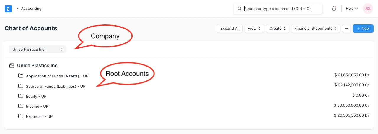 Chart of Accounts is a tree view of the names of the Accounts (Ledgers and Groups) that a Company requires to manage its books of accounts. ERPNext sets up a simple chart of accounts for each Company you create, but you can modify it according to your needs and legal requirements.