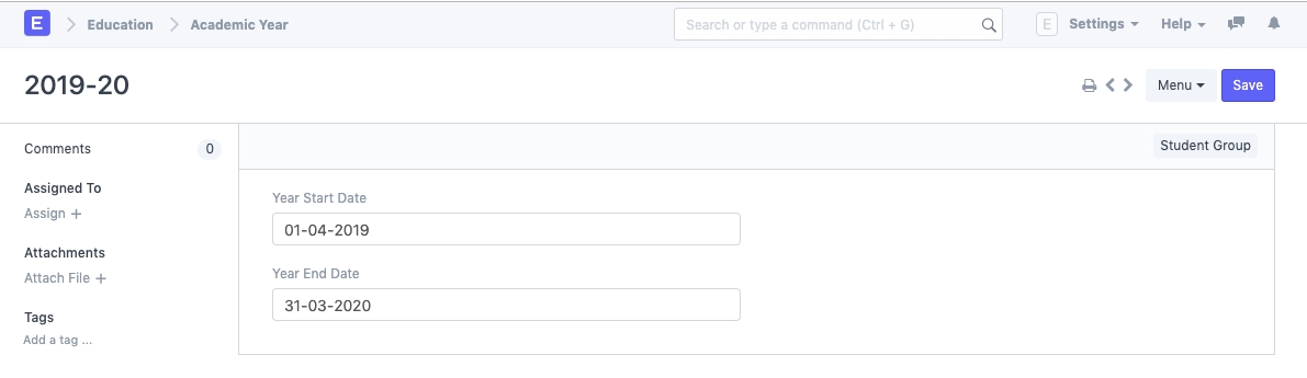 An academic Year can be further liked to a Student group, which can be created from an Academic Year.