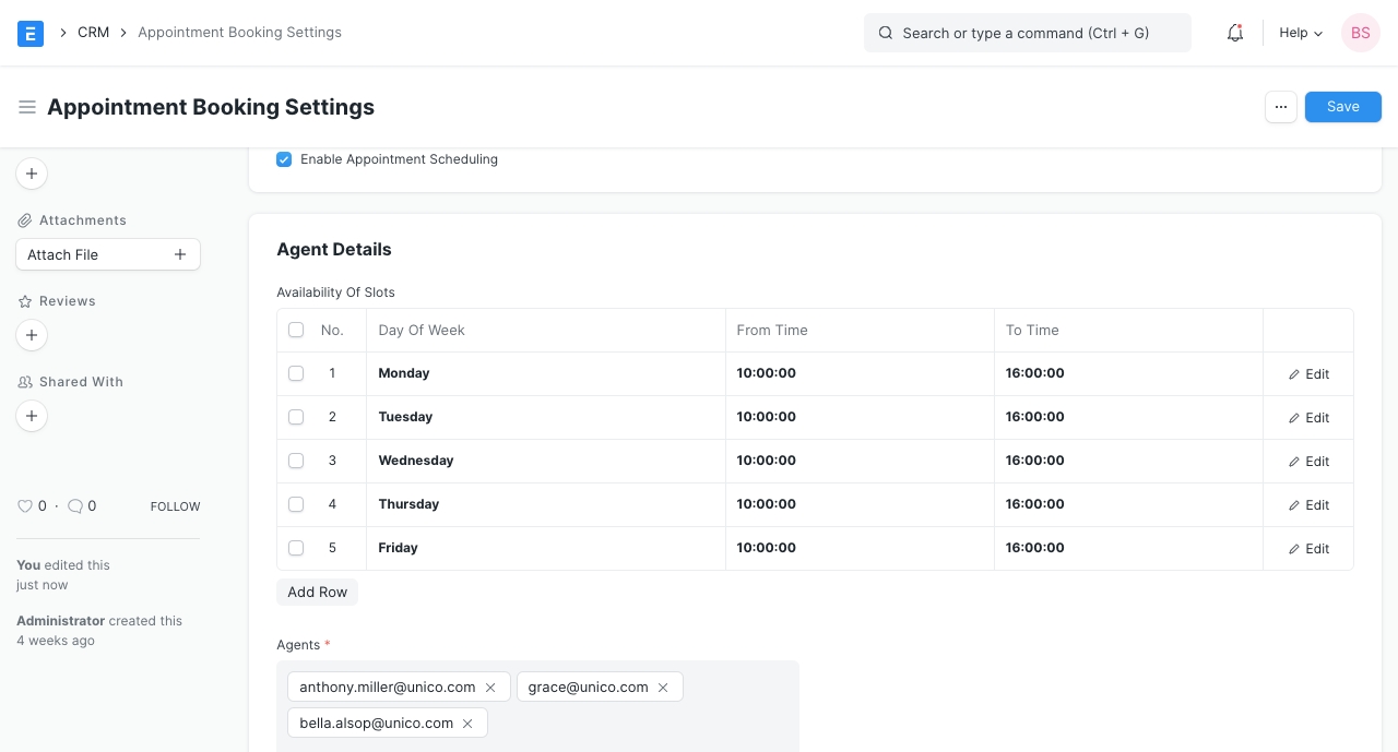 Here you can set the timing in which your agents are available to attend an appointment. This is set per day of the week. Each row represents a continuous block of time, you can have multiple entries for each day of the week.