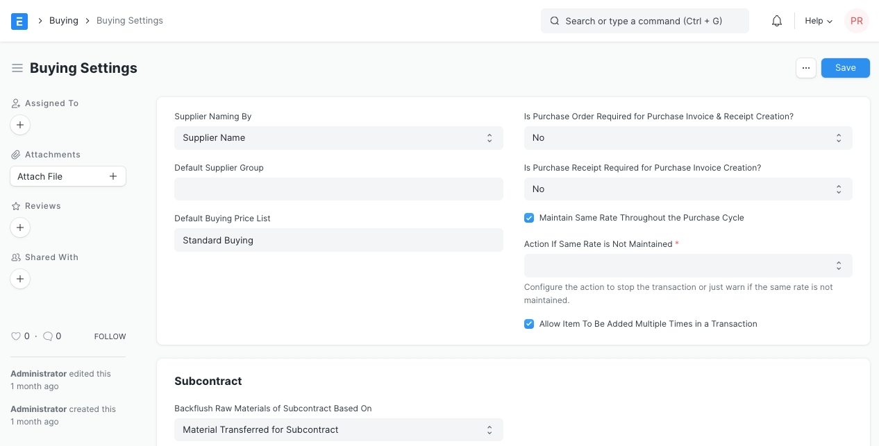 Buying Settings is where you can define properties which will be applied in the Buying module's transactions. You can find Buying Settings at: > Home > Buying > Settings > Buying Settings