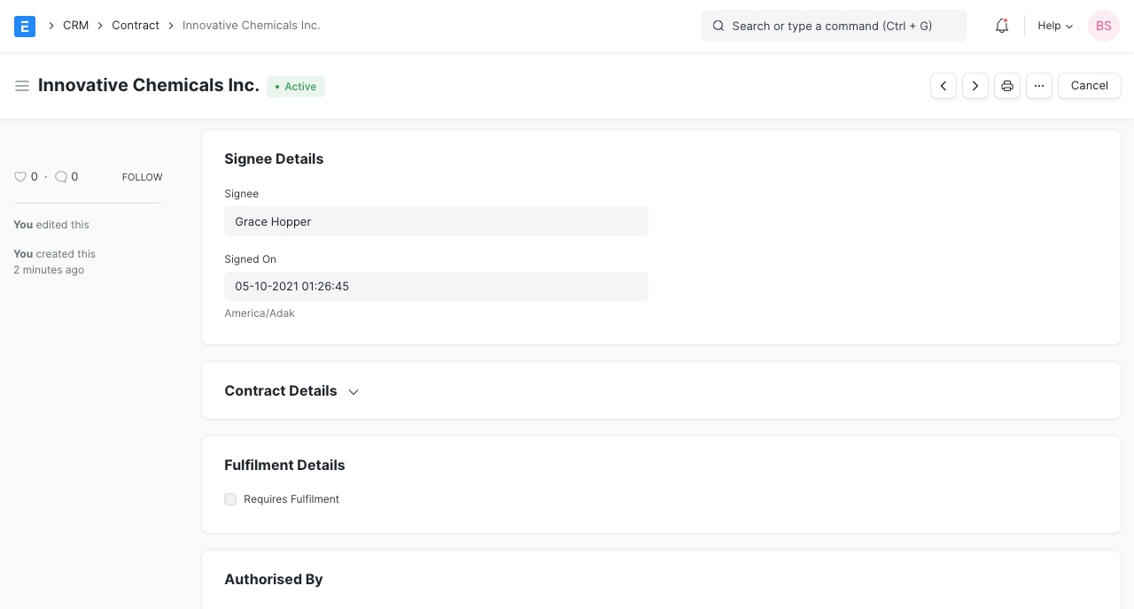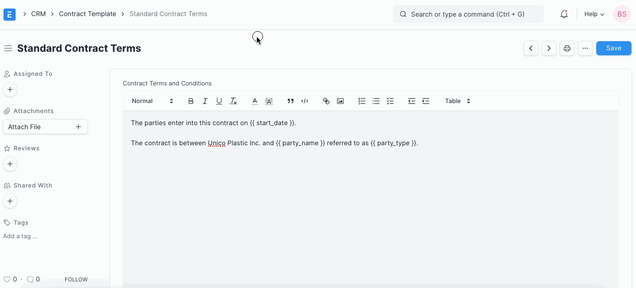 Enter the terms of the Contract in the Contract Terms field. You can create a Contract Template and the template can be selected to fetch the Contract Terms.