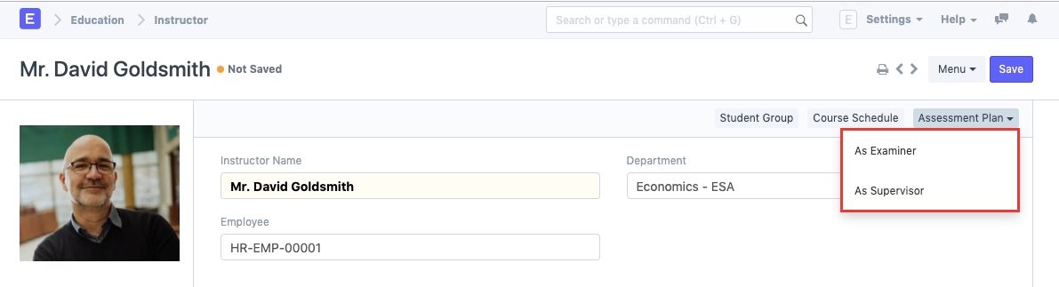 > Note: While creating an Assessment Plan from the Instructor, the user can select whether the Instructor has to be kept as a Supervisor or as an Examiner for the Assessment plan.