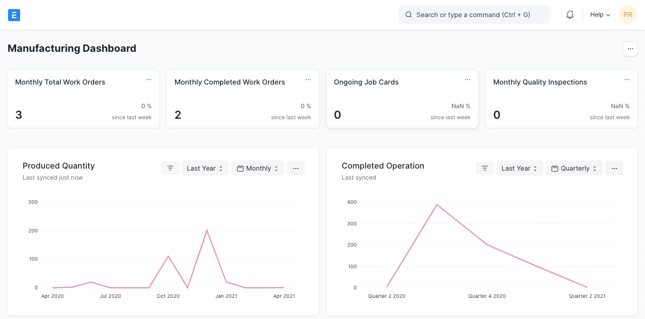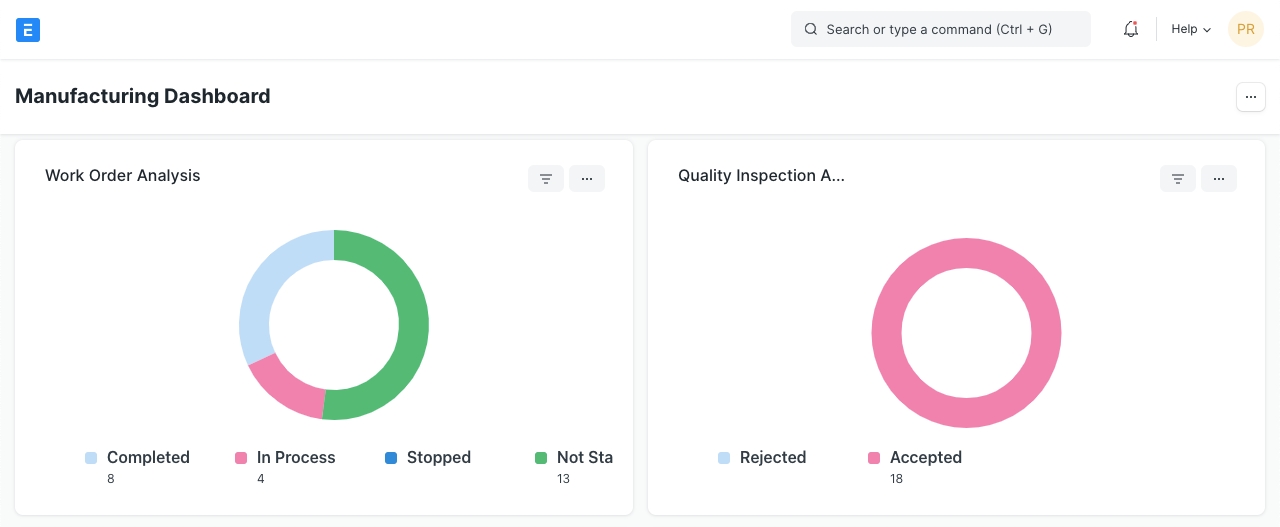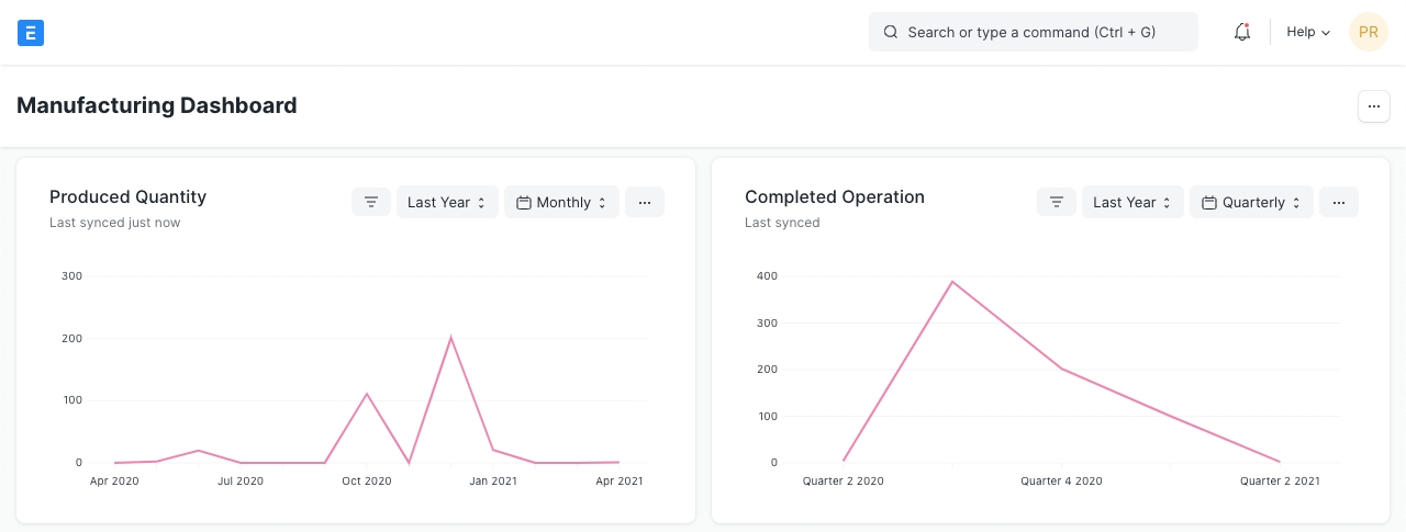 You can see some predefined graph reports in the dashboard when you open the Manufacturing module. These reports are fully customizable, you can choose what to show or hide and also configure the metrics on which the reports are shown.
