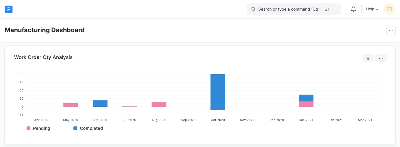 The chart will give information about the total number of quantities that are Pending and Completed based on the Work Orders every month for the last year.