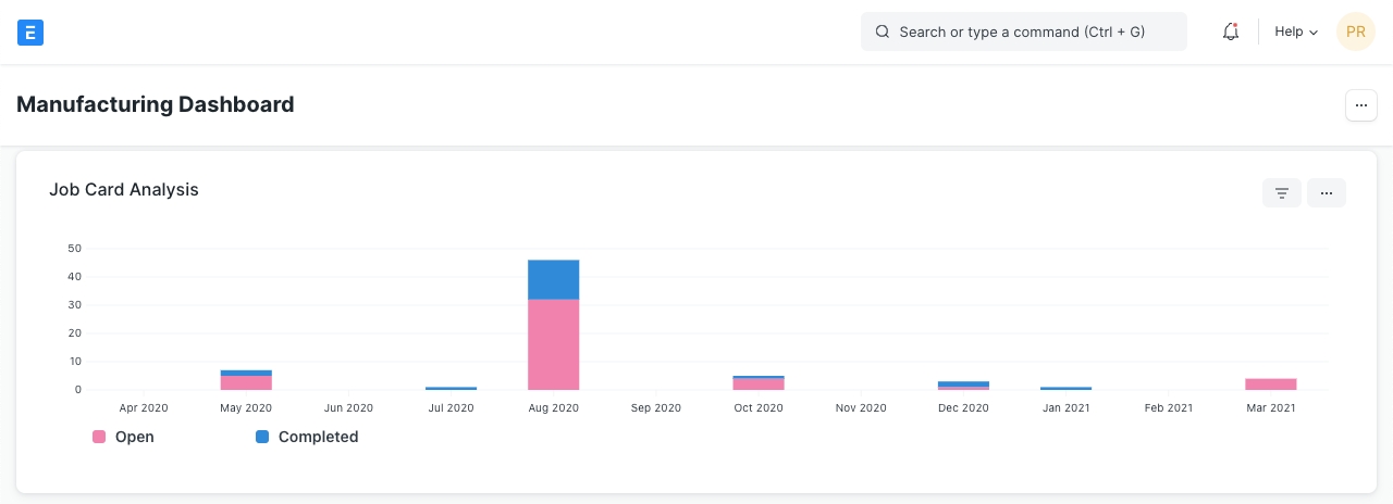 The chart will give information about the total number of Job Cards which are in the Pending and Completed states every month for the last year.