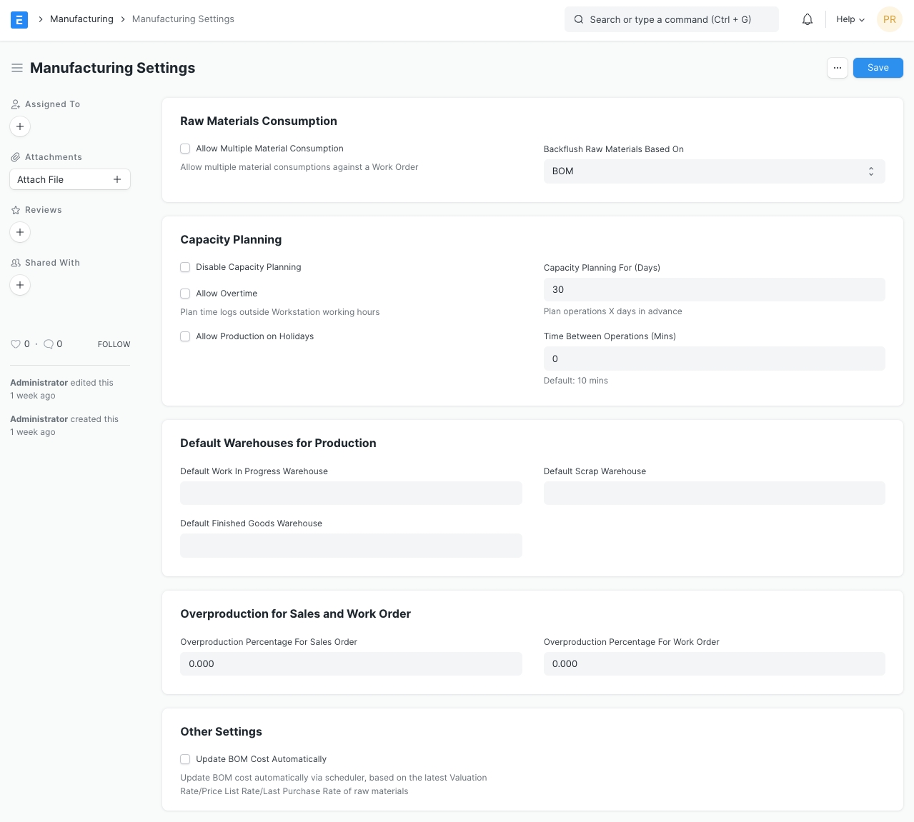 > Home > Manufacturing > Settings > Manufacturing Settings