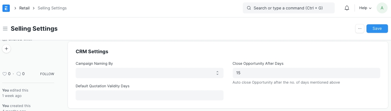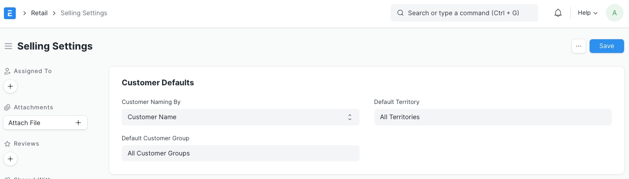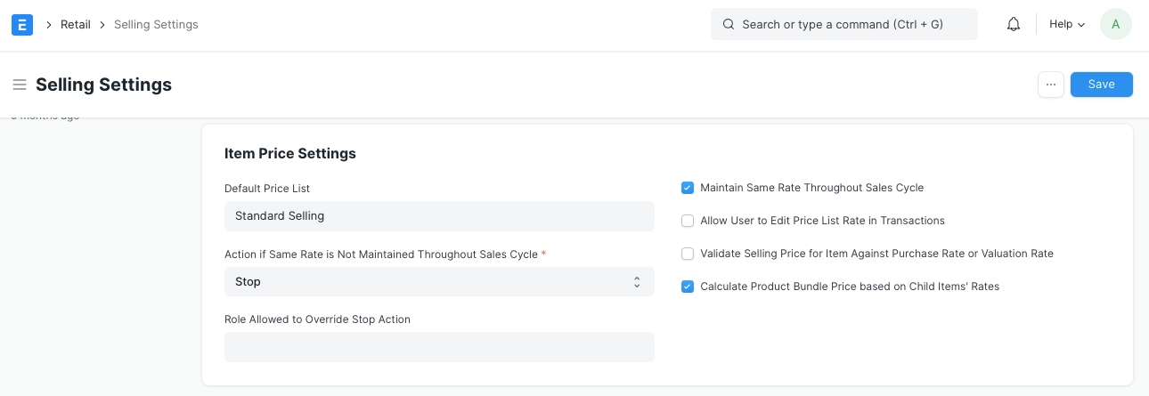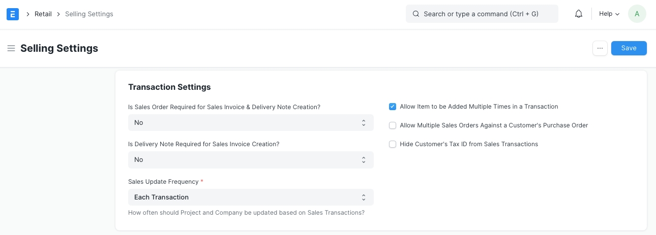 Selling Settings is where you can define properties and validations which will be applied to the masters and transactions involved in the sales cycle.