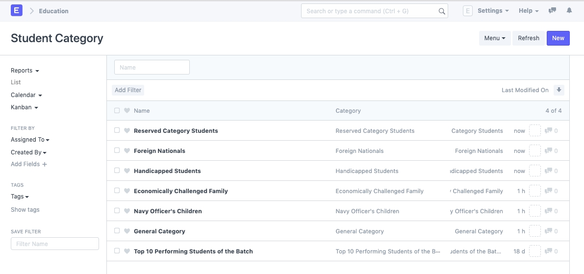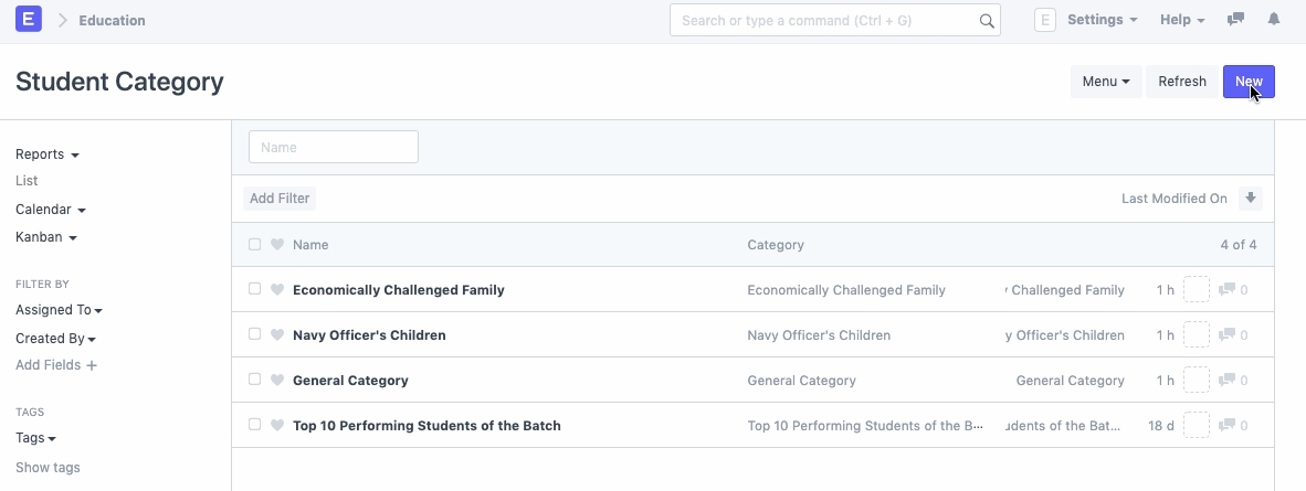 To create a new student category, click on New Student Category and add the name of the Student Category.