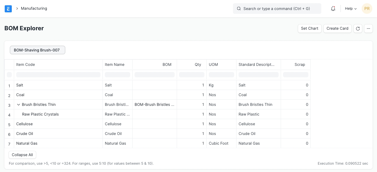 BOM Explorer Report shows a complete hierarchy of the Bill of Materials (BOM) with its raw materials in the form of the tree view.