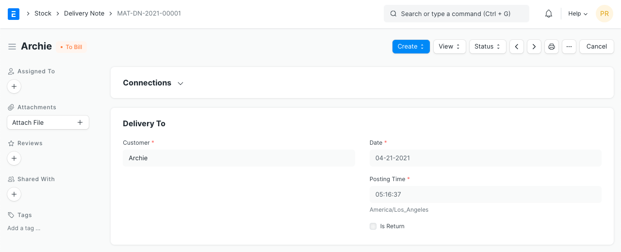 The entry of the Delivery Note is very similar to a Purchase Receipt. It is usually created from a “Submitted” Sales Order (that is not shipped) by clicking on Create > Delivery.