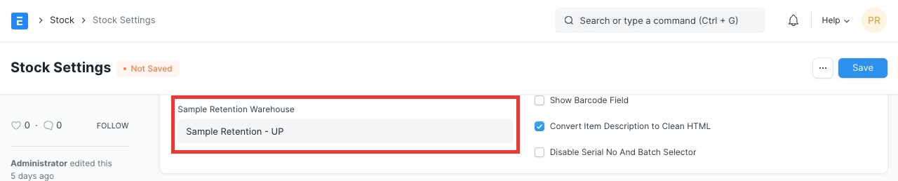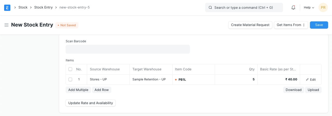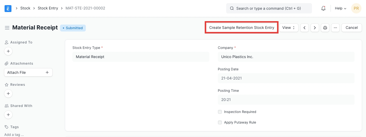 Sample Retention Button Clicking this button will direct you to new Stock Entry of type 'Material Transfer'. This entry is transfering your sample retention from your Target Warehouse (Stores) to the Sample Retention Warehouse. It will contain all the information, verify and click Submit.