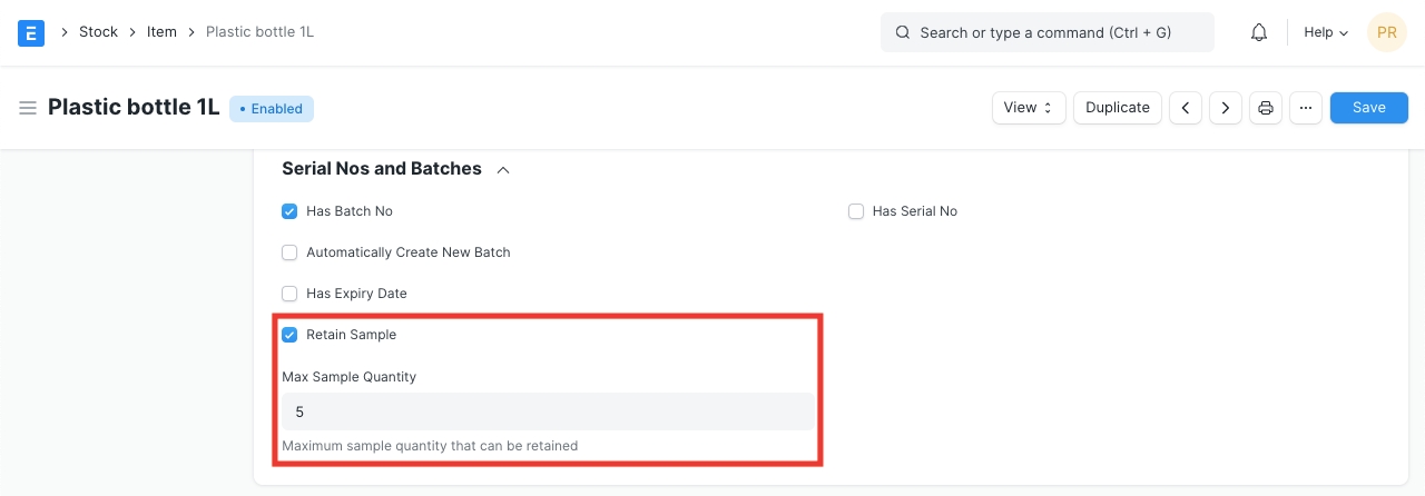 Retain Sample is based on Batch hence Has Batch No should be enabled first. Check Retain Sample and set the Maximum allowed samples for a batch.