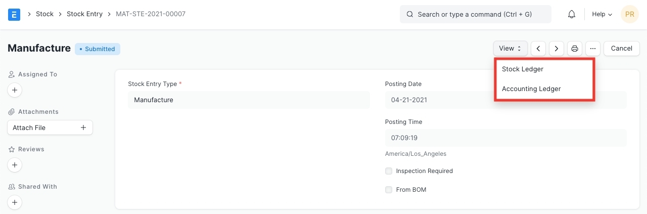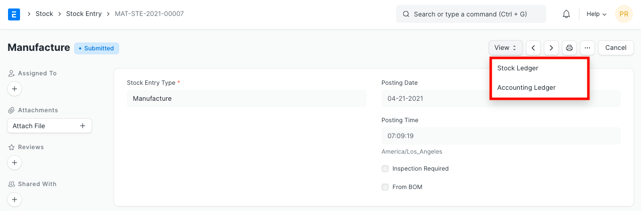 After submitting a Stock Entry, you can go to the stock ledger or the accounting ledger from the dashboard.