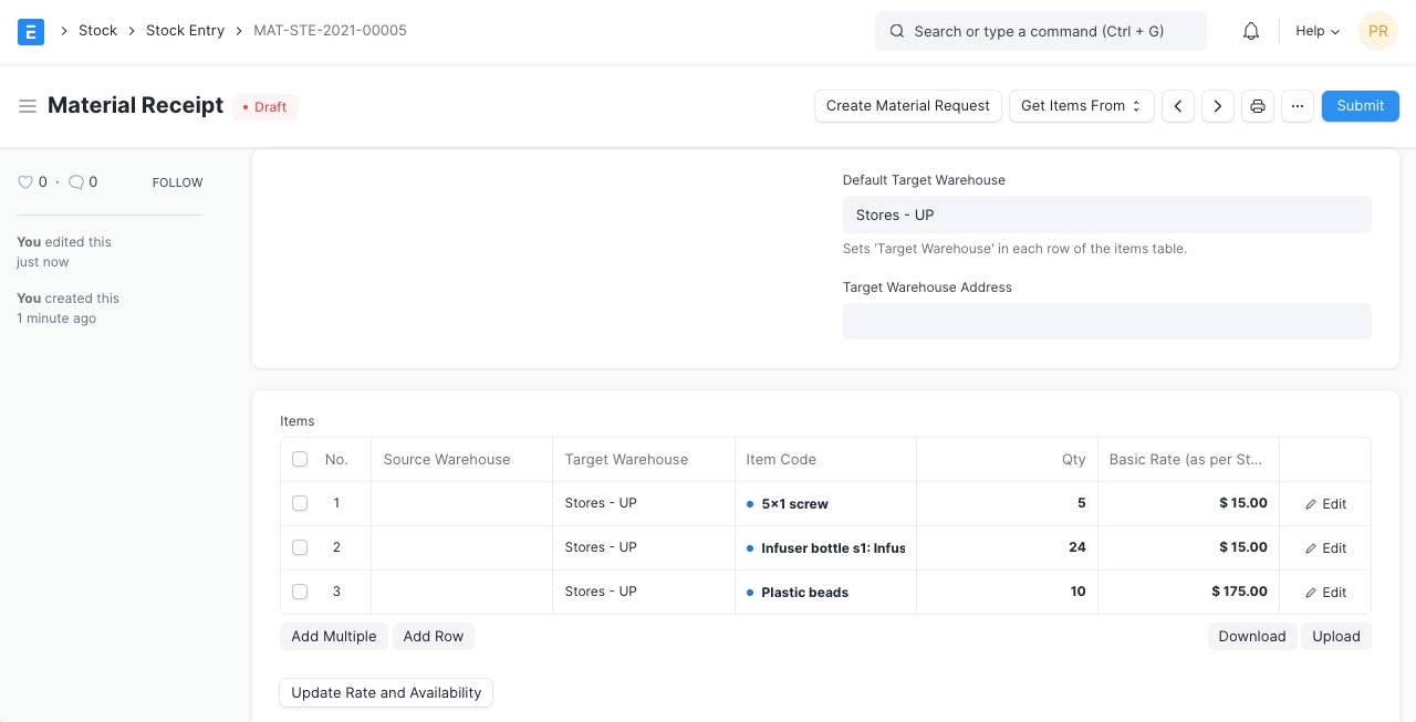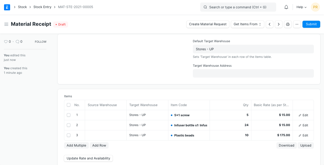 Material Receipt: If the material is being received (Incoming Material). The Items will be added to the Warehouse set under Target Warehouse.