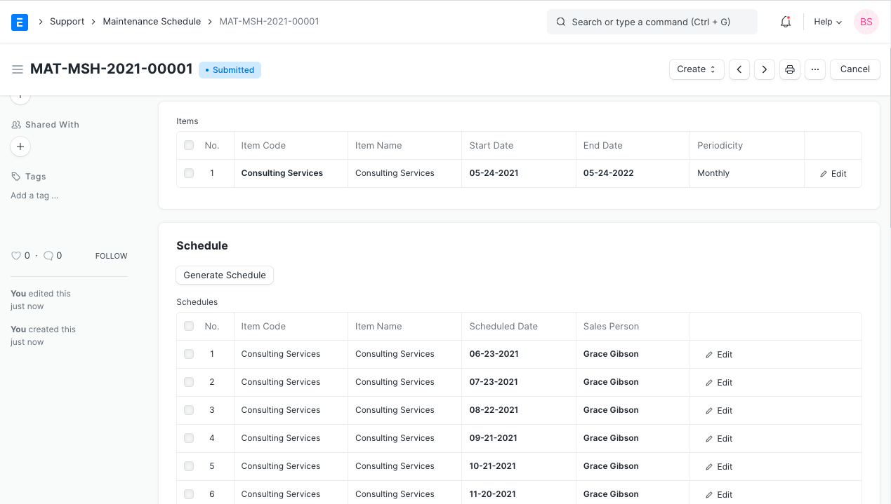 The Generate Schedule button will generate a separate row for each maintenance activity. Each Item in a Maintenance Schedule is allocated to a Sales Person.