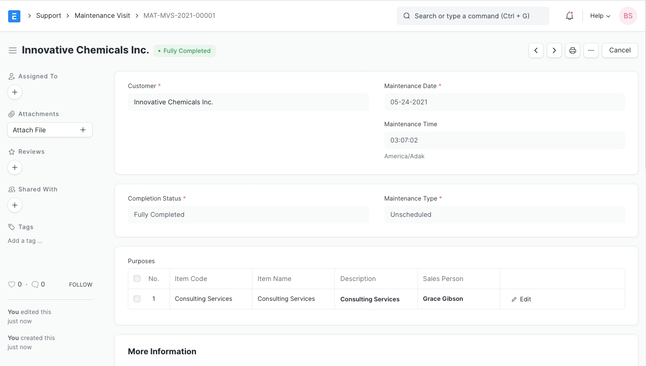 Enter a Description of the maintenance, select the Sales Person performing the maintenance, and enter the work done.