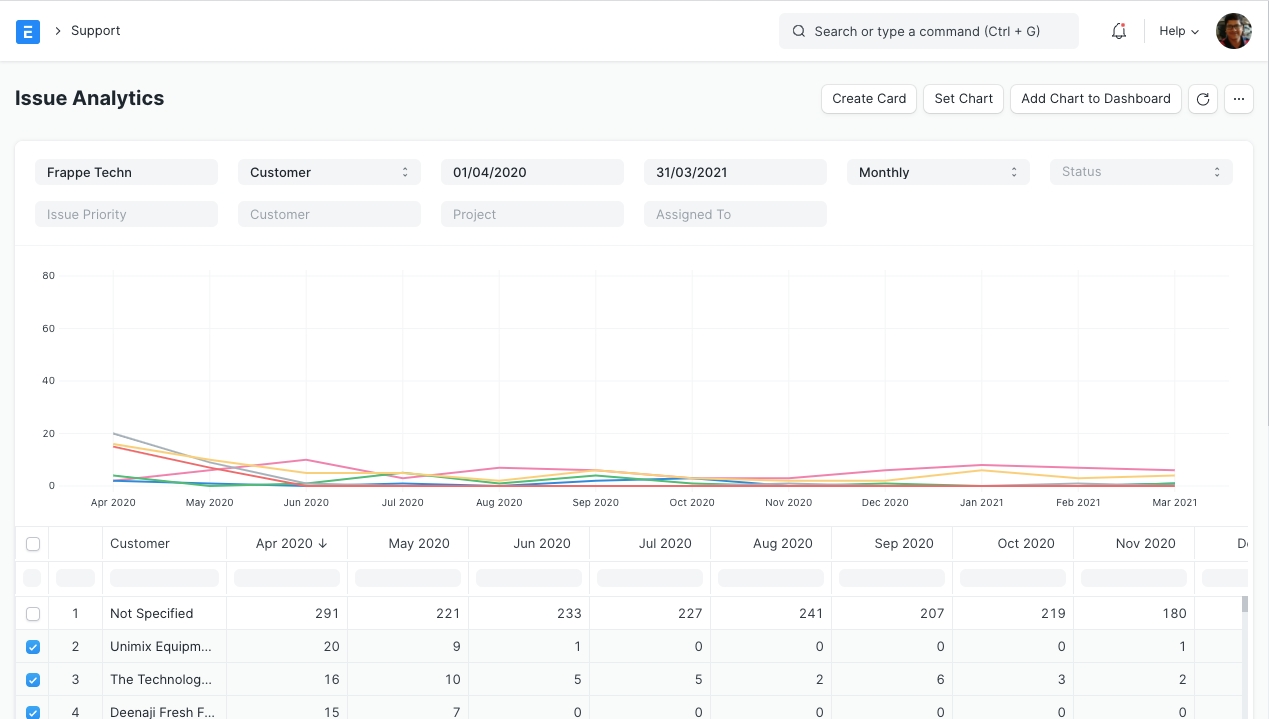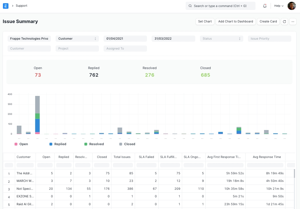 The various reports in the Support module help understand data on how quickly support staff responded to customer issues, the issue types, issue priorities, timelines, and more.