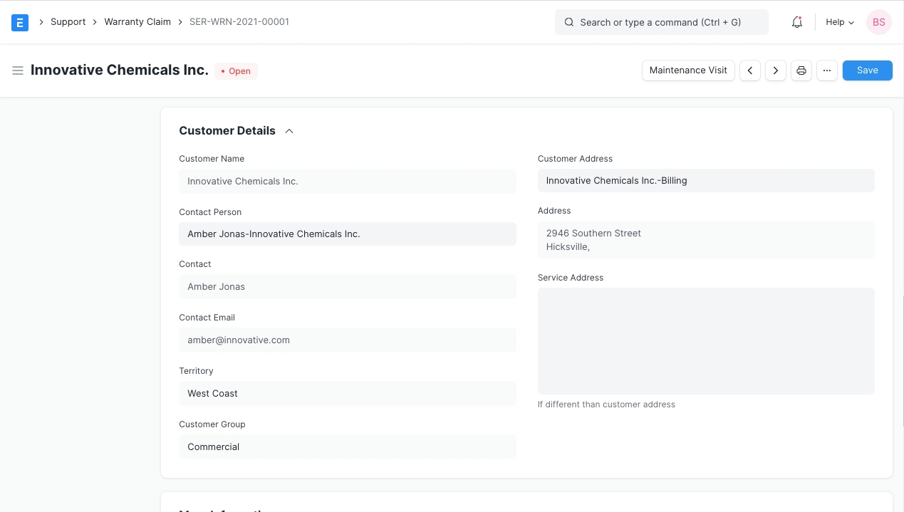 If a Customer visit is required to address the issue, you can create a new Maintenance Visit record from this.