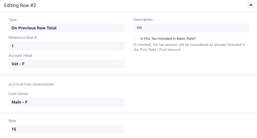 Then add a new row and select type of tax as On Previous Row Total and select or add new tax as VAT and set rate at 15%.