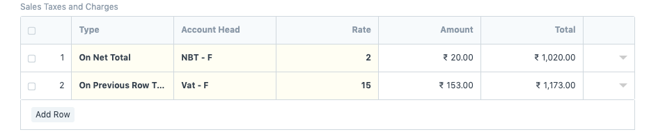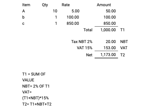 Consider a prospect wants to apply tax on a tax. Let's take an example tax (NBT) is to be applied on the net total amount of items and then apply another tax (VAT) on it.