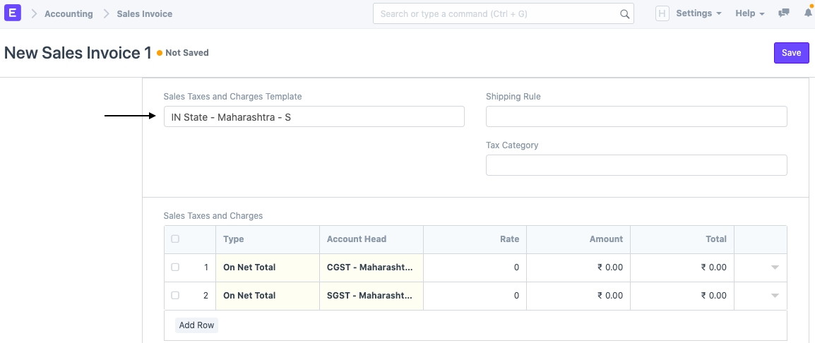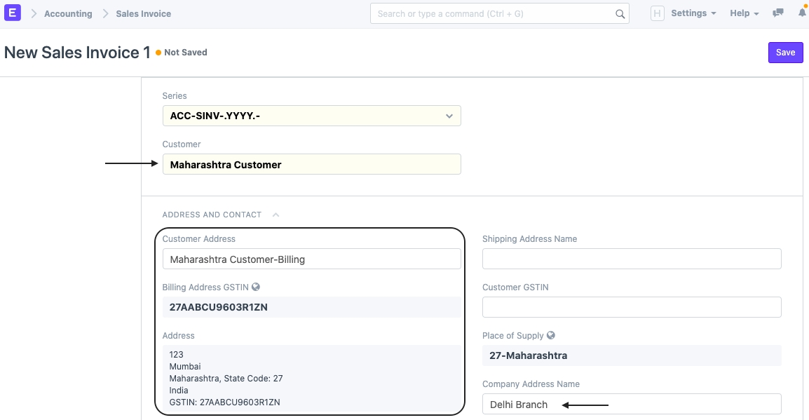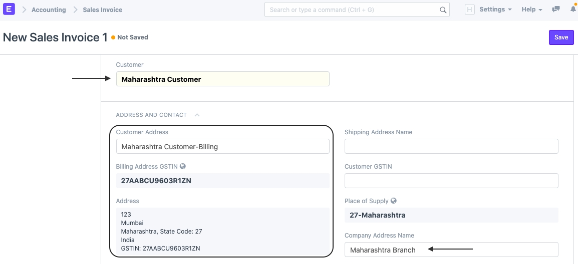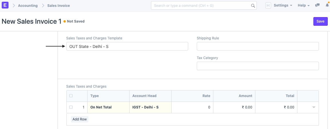 Here I have selected a Customer from Maharashtra and Company's Address as Delhi, it should fetch the OUT State template we created above.