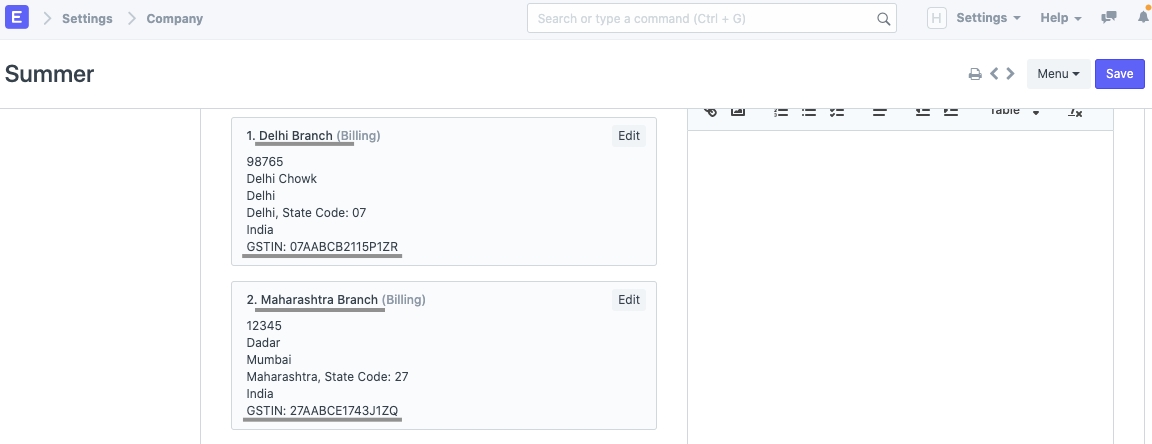 The very first step is to update your company’s branch wise Address with appropriate GSTIN as it will differ (if in different states) from branch to branch.